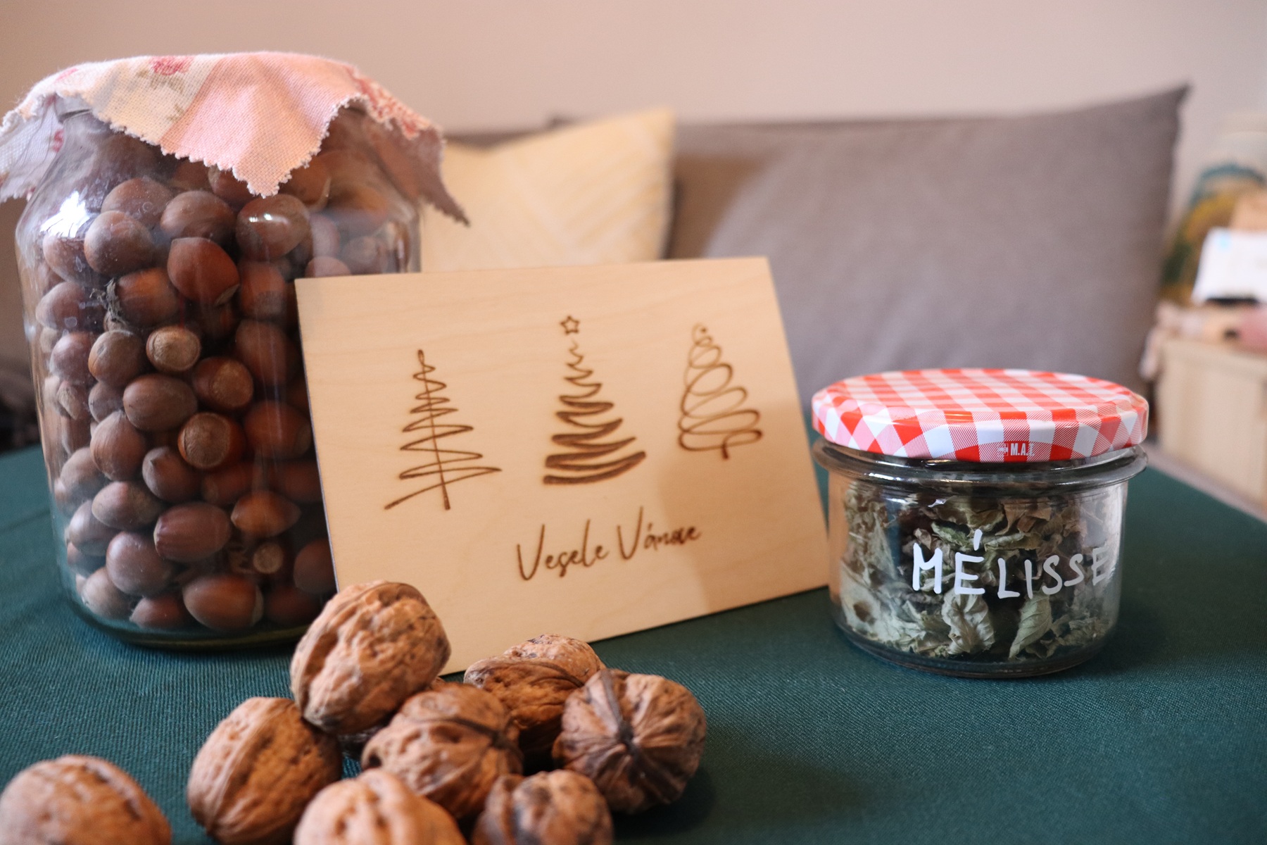 Nasbírané a vylouskané ořechy, nasušené ovoce, domácí marmelády, omáčky nebo třeba bylinky ze zahrádky jsou krásným dárkem pro všechny. Samozřejmě v tomto směru je dobré myslet o něco dopředu a možná už od léta schraňovat. Nemusí to však být jen z vlastní zahrady, ale v čase hojnosti uschovat kousek léta do sklenice nebo sáčku. Bylinky v hezkých sklenicích jsou za mě velmi milým dárkem. Stejně tak sklenice kysaného zelí, okurek nebo kompotu.