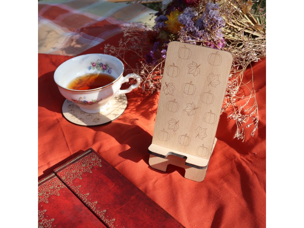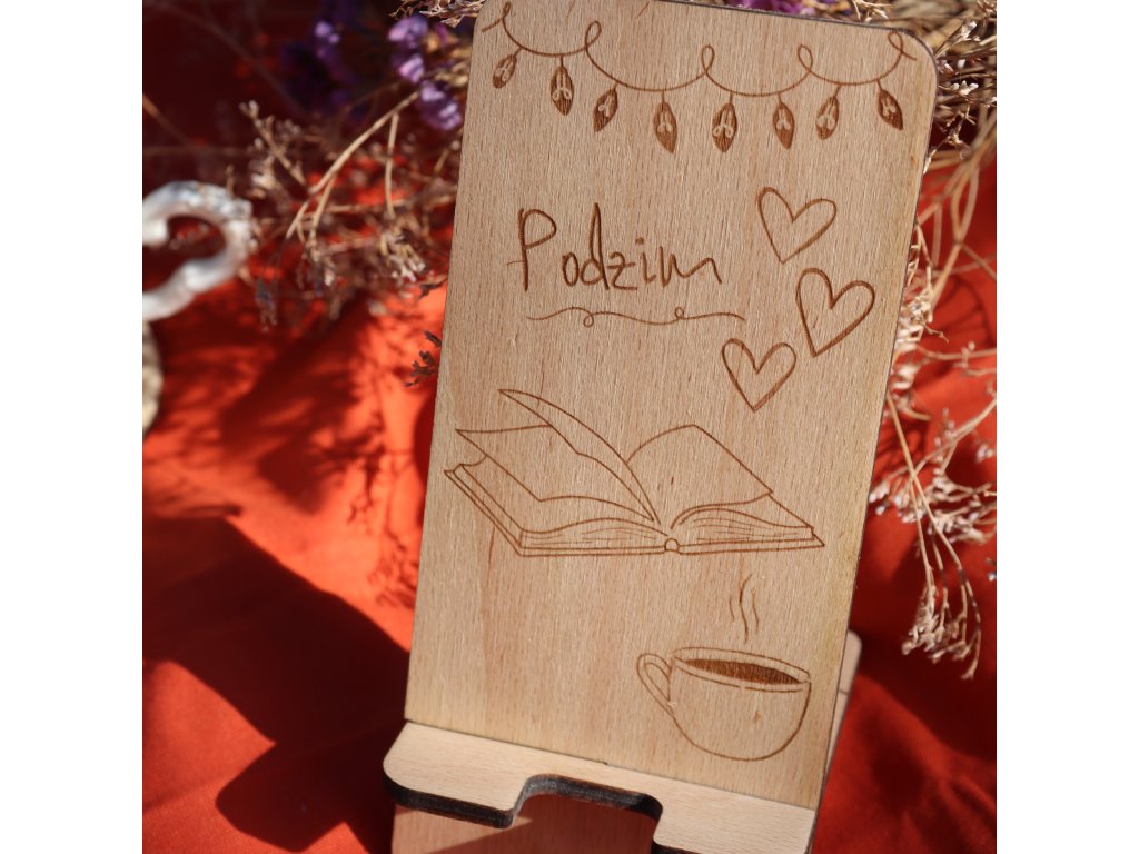 Dřevěný stojánek na telefon s gravírováním. Ideální pro chvíle pohody s čajem a knihou. Dostupný ve 2 variantách – „Podzim a kniha“ nebo „Listy a dýně“. Praktický doplněk, který vnese do vašeho domova hřejivou atmosféru podzimu.