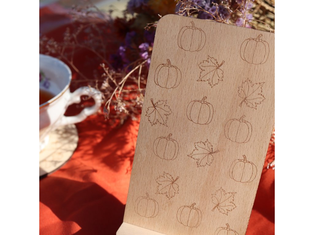 Stojánek je vyroben z přírodního dřeva a zdoben jemným gravírováním s podzimními motivy. Dostupný je ve dvou variantách – romantické s nápisem Podzim a knížkou, nebo minimalistické se vzorem dýní a listů.